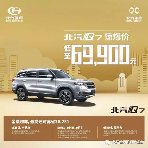 比如你現(xiàn)在購買一臺北汽Q7,這款車目前全系最高優(yōu)惠18000元,起步價僅需6.99萬元。你可以選擇北汽Q7專屬金融方案——“50/50,0利息,0月供”貸款購買。首付僅需3.5萬元,不需要利息和月供,一年后再付清剩下的尾款即可。這樣你不止可以提前享受有車生活,提高家庭的生活品質(zhì),也讓銀行承擔了你的人民幣貶值損失,豈不快哉?