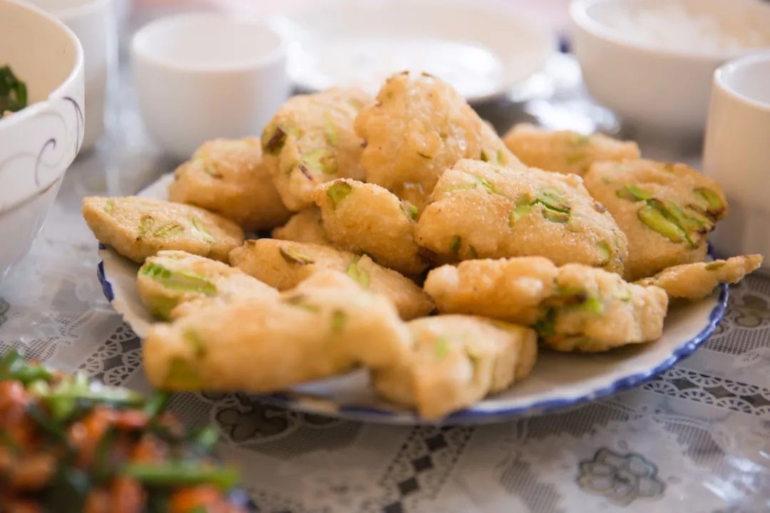 還有一道菜是我特別喜歡的,問向?qū)Т蟾缢牟嗣鞘裁?,答曰:“蠶豆包包”,是當?shù)厝说慕蟹?,模樣長得乖巧,名字也這么可愛呢。它更像是一道餐后小甜點,軟軟的糯米包裹著酥松的蠶豆入鍋炸,外酥里嫩,吃的時候蘸少許白糖,口感極佳。