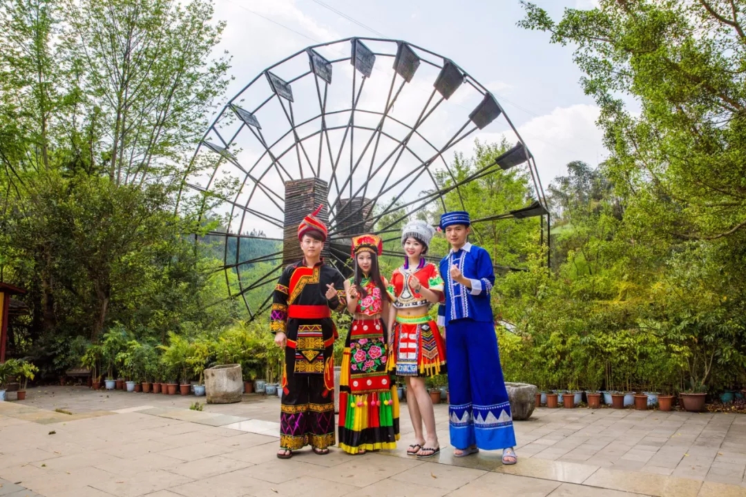 看完油菜花田,我們循著明代著名旅行家徐霞客的足跡來到多依河畔,換上少數(shù)民族服飾,坐在竹筏上漂流,體驗純正的民族風情。古老而巨大的圓盤水車,嘎吱嘎吱地轉(zhuǎn)動著,仿佛把我們帶進古老的年代。