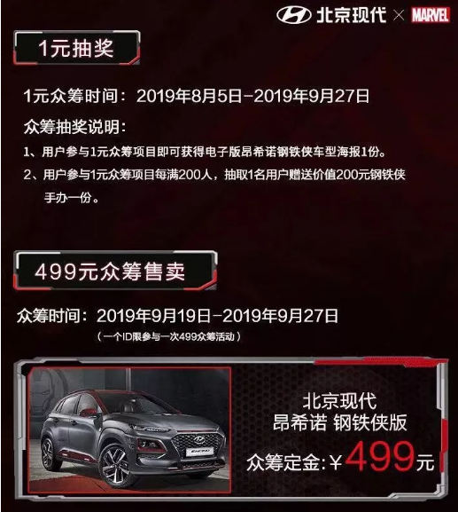 2019年9月19日零點,北京現代昂希諾 鋼鐵俠版于阿里魚眾籌平臺-“造點新貨”正式發(fā)售,官方指導價格為14.99萬元。