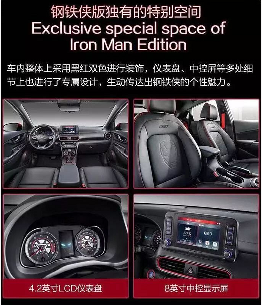 在產品設計上,昂希諾 鋼鐵俠版的車身采用雙色調設計,配有鋼鐵俠專屬以太紅和鈦金灰飾面,多處細節(jié)加入IRONMAN及MARVEL字樣,重新設計的車身前部酷似面具,獨特的日間行車燈形似鋼鐵俠犀利的雙眼。車內采用紅黑雙色裝飾,液晶儀表盤中融入鋼鐵俠頭盔啟動效果,生動傳達出鋼鐵俠的個性魅力。