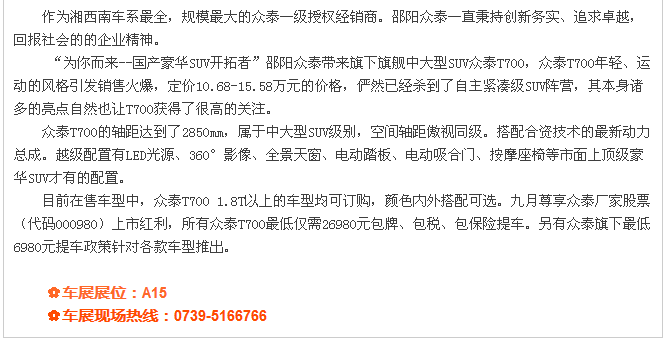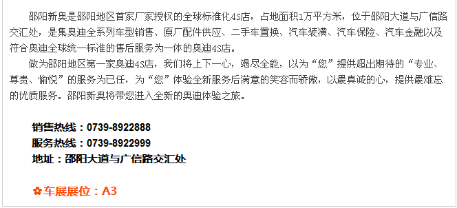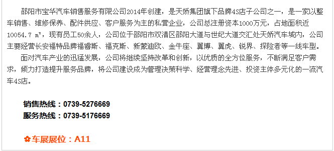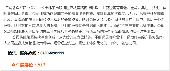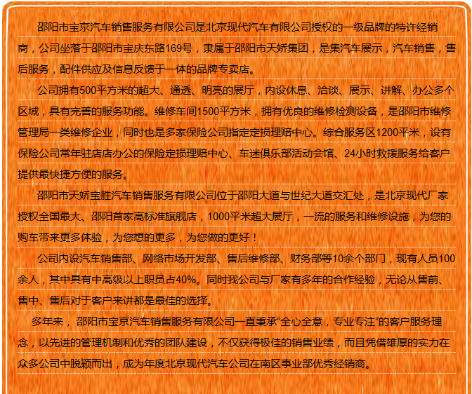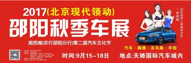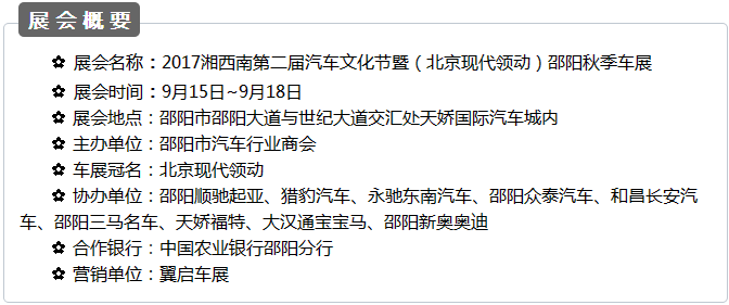 【915-918邵陽(yáng)秋季車(chē)展】 9月15日-9月18日,2017湘西南第二屆汽車(chē)文化節(jié)暨(北京現(xiàn)代領(lǐng)動(dòng))邵陽(yáng)秋季車(chē)展將于天嬌國(guó)際汽車(chē)城隆重舉辦。本屆車(chē)展由邵陽(yáng)市政府批準(zhǔn)、邵陽(yáng)市汽車(chē)行業(yè)商會(huì)主辦、北京現(xiàn)代領(lǐng)動(dòng)冠名,邵陽(yáng)順馳起亞、獵豹汽車(chē)、永馳東南汽車(chē)、邵陽(yáng)眾泰汽車(chē)、和昌長(zhǎng)安汽車(chē)、邵陽(yáng)三馬名車(chē)、天嬌福特、大漢通寶寶馬、邵陽(yáng)新奧奧迪協(xié)辦,合作銀行為:中國(guó)農(nóng)業(yè)銀行股份有限公司邵陽(yáng)分行。此次車(chē)展不僅僅是一場(chǎng)視覺(jué)的盛宴,更是一場(chǎng)震撼的汽車(chē)文化之旅!今天小編就給大家著重介紹一下此次車(chē)展冠名及協(xié)辦單位。