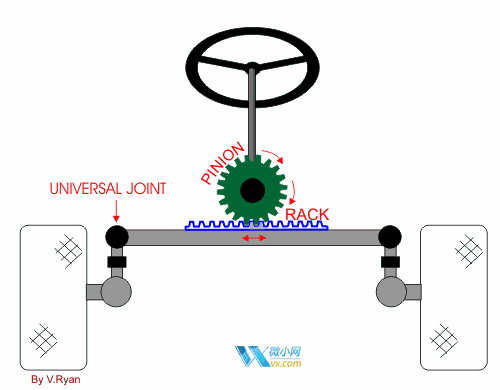 轉(zhuǎn)動轉(zhuǎn)向盤時,可帶動小齒輪轉(zhuǎn)動,這個小齒輪與一條齒條相吻合,帶動齒條左右直線運動,并推動轉(zhuǎn)向輪左右擺動,從而實現(xiàn)轉(zhuǎn)向功能。齒輪不是簡單的平齒輪,而是特殊的螺旋形狀,這可改善轉(zhuǎn)向時的柔順感。