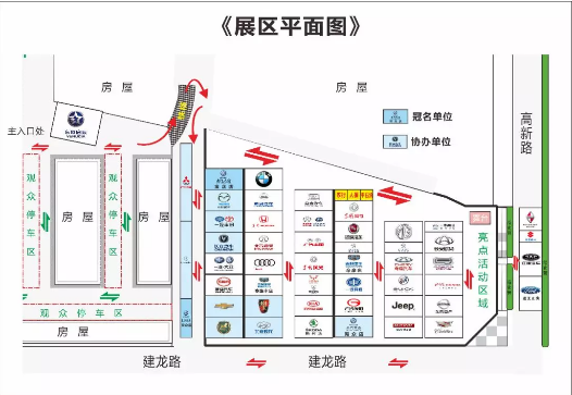 主入口處有車(chē)展專(zhuān)用觀光車(chē)接送到展區(qū),??空军c(diǎn)依次為主入口——龍騰上汽大眾——直升機(jī)(亮點(diǎn)活動(dòng)區(qū)域)。