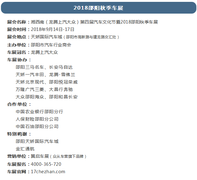 湘西南(龍騰上汽大眾)第四屆汽車(chē)文化節(jié)暨2018邵陽(yáng)秋季車(chē)展將于2018年9月14日-17日在邵陽(yáng)市天嬌國(guó)際汽車(chē)城舉辦。
