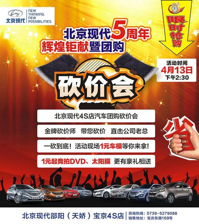 北京現(xiàn)代5周年輝煌鉅獻暨團購砍價會活動時間:4月13日下午14:30北京現(xiàn)代4S店汽車團購砍價會,金牌砍價師,帶您砍價,直擊公司老總,一砍到底!活動現(xiàn)場1元車模等你來拿、1元起競拍DVD導航、太陽膜,更有豪禮相送.