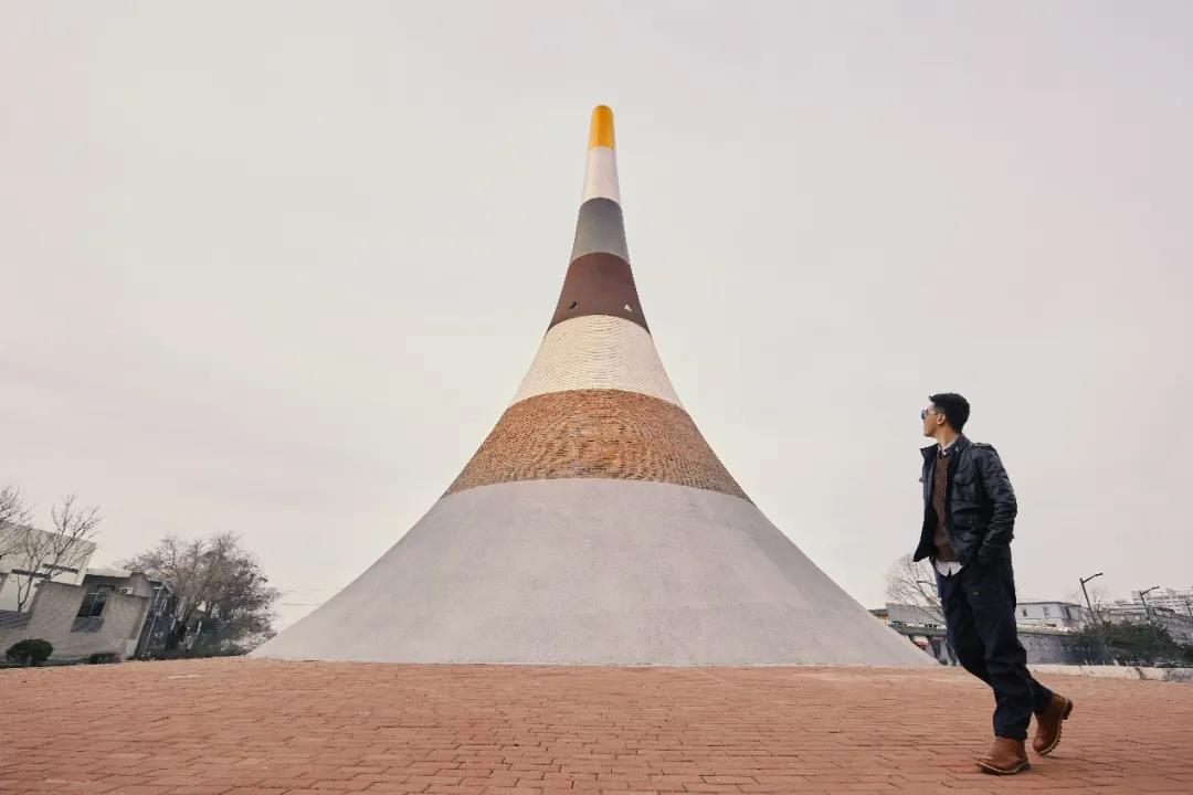 凡是駕車去到宋莊藝術區(qū)的人,在行徑宋莊環(huán)島時一定會留意到環(huán)島中間高聳的地標性的建筑,陳靈平稱它為“七層塔”。它像倒扣的喇叭,從下往上逐漸收緊,以水泥、紅磚、鋼鐵等不同的材質層層堆疊,一直延伸到金燦燦的頂尖。